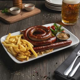 400/300/50 гр.ассорти из 5-х видов колбасок: "Люкс", "Бюргерские", "Каминвурст", "Краинские", "Бескиден", немецкая капуста, картофель фри, дижонская горчица