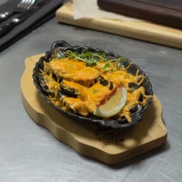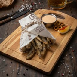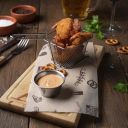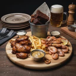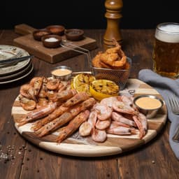 800/150 гр.куриные крылья, креветки жареные, чесночные гренки, картофель фри, соус блю-чиз, соус айоли, горчица Ассорти "ШримпХофф"