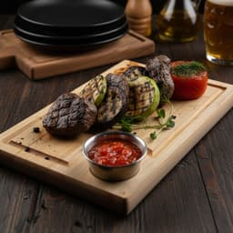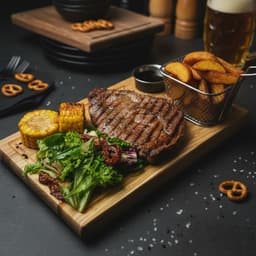 220/200/50 гр.стейк, кукуруза гриль, листовой салат, картофель по-деревенски, соус наршараб