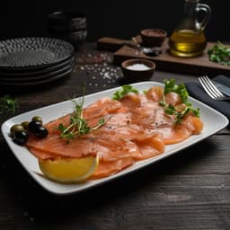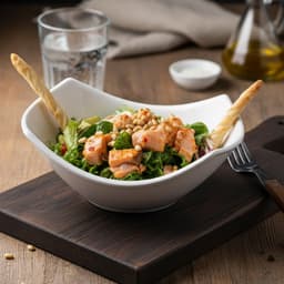 240 гр.семга, авокадо, струч, фасоль, черри, кедр. орех, листья салата, горчичн. соус