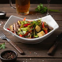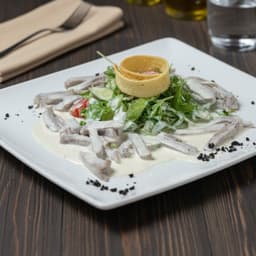 250 гр.теплый салат с язычками теленка, черри, болг. перец, огурчики, листья салата, заправка от шефа