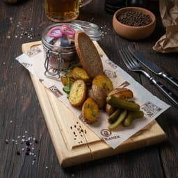400/150/50 гр.колбаска "Бюргерская" из индейки длиной полметра с добавлением вяленных томатов и базилика, корнишоны, картофель по-пушкински, острая горчица