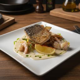 150/150/50 гр.судак, тигровые креветки, томаты черри, стручковая фасоль, соус биск