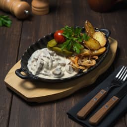 320 гр.телячья вырезка, грибы, сливочный соус, картофель по-деревенски, корнишоны