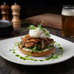 250 гр.ростбиф, булочка бриошь, микс салата, маринов. огурчики, яйцо пашот, лучок фри, немецкая заправка